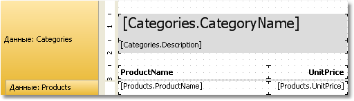 Вложенность бэндов данных хорошо видна на структуре бэндов в левой части окна. После этого нужно привязать бэнды к соответствующим источникам данных и расположить поля данных на бэндах. Мы будем использовать связанные источники данных Categories (Категории) и Products (Продукты) из демонстрационной базы данных, которая поставляется в комплекте FastReport: