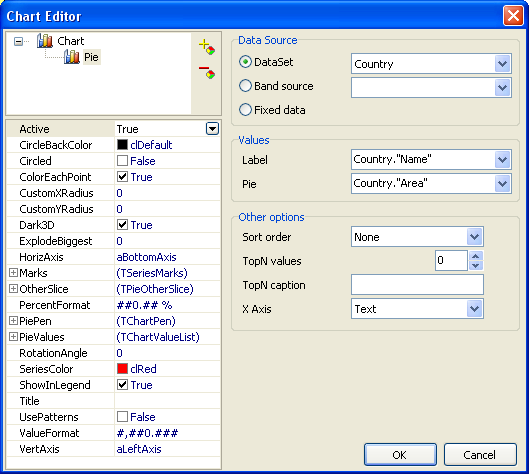 Let's make an example report with a simple chart. The chart will use the “Country” table from the DBDEMOS database that comes with Delphi . The table contains data about countries, their areas and populations: