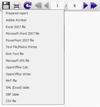 Rendered report can be saved in one of formats: a file prepared report (fpx), Adobe Acrobat (PDF), Microsoft Word 2007, Excel 2007, PowerPoint 2007, TXT, RTF, Microsoft XPS, OpenOffice Calc, OpenOffice Writer, MHT, HTML, Excel, XML, DBF table, CSV.
