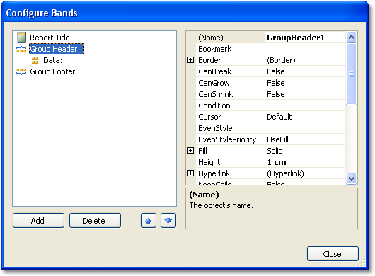 First method: you add the "Group header" band in the "Configure Bands" window. To do this, press the "Add" button and select the "Group header" band. FastReport adds the group to the available "Data" band or will create a whole group, if such a band is not in the report: