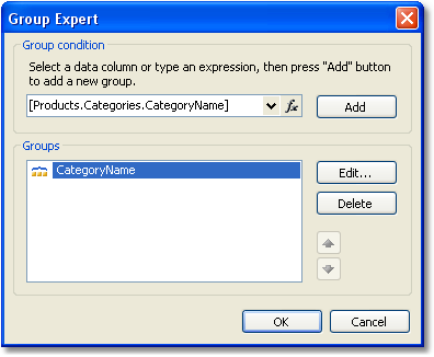 Second method: you use the wizard, which can be called from the "Report|Group Expert..." menu. In order to create a group, enter the group condition and press the "Add" button:
